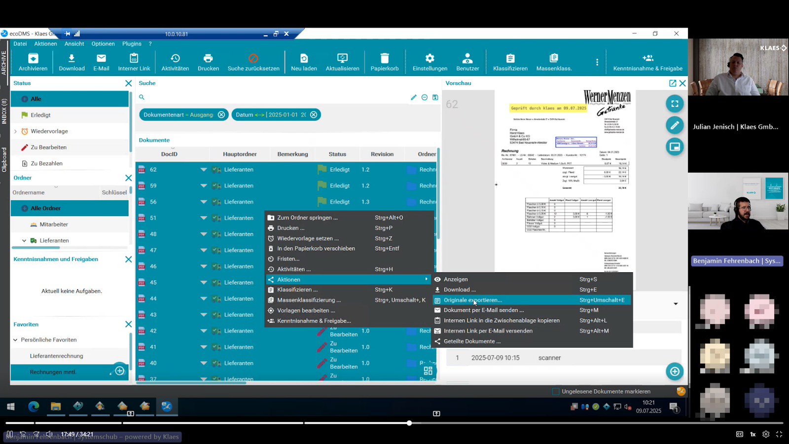 Mit einer Beispielrechnung demonstrierte er, wie man durch Vorlagenerstellung und Automatisierung den Bearbeitungsprozess effizient gestalten kann – inklusive Statusänderungen, Stempeln zur Prüfung und dem Export von Daten für den Steuerberater.