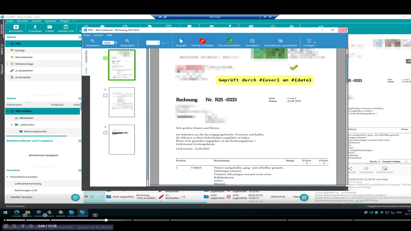 Er führte live durch die wichtigsten Funktionen: Jedes Dokument erhält eine eindeutige ID, wird revisionssicher gespeichert und bei Änderungen automatisch versioniert. „So bleibt alles nachvollziehbar – ganz ohne Papierordner“, betonte er. Markierungen, Notizen und Stempel wie „geprüft“ lassen sich direkt setzen, dazu kommen individuelle Status und eine frei gestaltbare Ordnerstruktur.