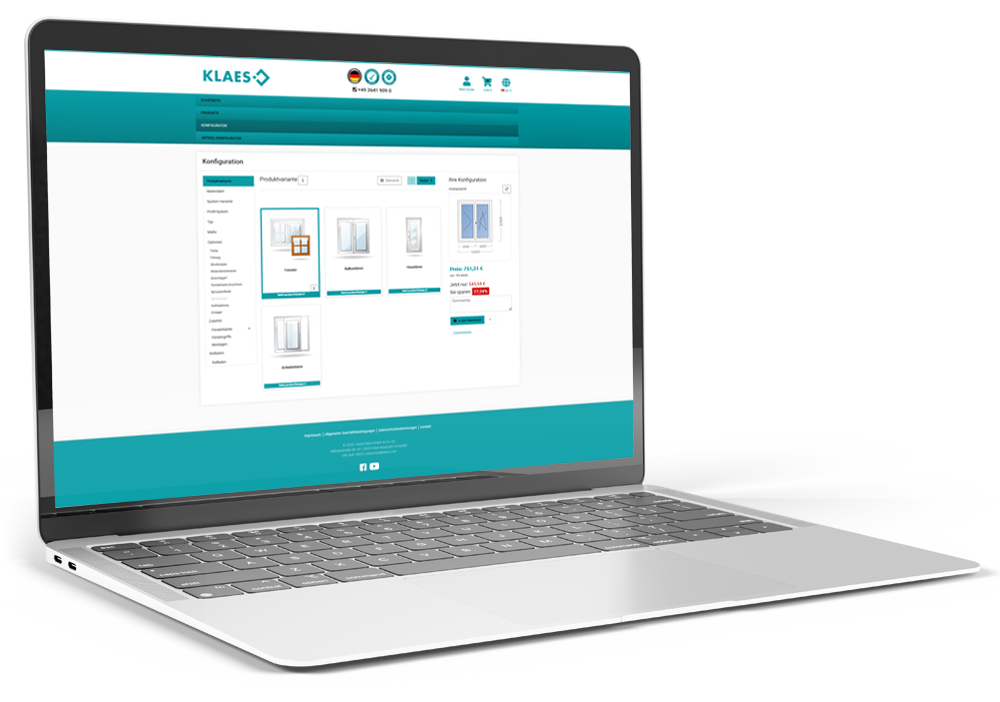Mit dem Klaes webshop haben Sie ein Werkzeug an der Hand, mit dem Sie Ihre Produkte optimal in Szene setzen können - ohne Programmierkenntnisse! Befüllen Sie den webshop mit den Daten Ihres Klaes Fensterbauprogramms und passen Sie ihn an Ihr individuelles Corporate Design an. Preise oder Inhalte aktualisieren Sie ganz einfach auf Knopfdruck.